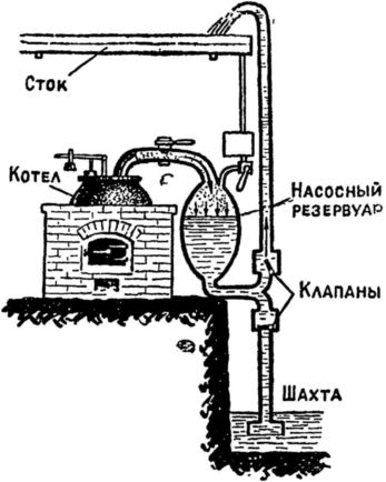 В том виде, как он был только что описан, насос Сэвери представлял собой уже несколько усовершенствованную французским физиком Дезагюлье конструкцию. Эта машина могла быть использована и на шахтах.