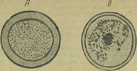 Некоторые из этих первых жителей Земли изменялись поколение за поколением. Одни из них просто становились больше, другие еще и усложнялись понемногу. Они превратились в маленькие круглые клетки, такие, какие нарисованы ниже. Сначала внутреннее строение их было совсем просто, как у той клетки, что помечена буквой А. Но потом, в следующих поколениях, внутри клетки появилось маленькое темное пятнышко. Тогда они стали такими, какими изображены на рисунке В. На этом, однако, их изменение остановилось; как будто они, изменив немного свое внутреннее строение, исчерпали навсегда свои силы и больше уже не могли меняться.