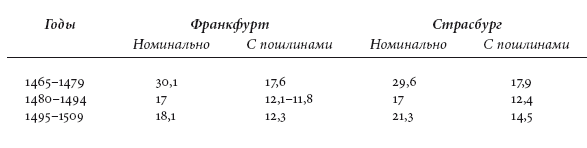 В Нюрнберге в середине XV в. цена грубого ржаного хлеба не превышала цену зерна более чем на 30 %, зато белый хлеб высокого качества стоил в первой половине века на 223 % дороже пшеницы. Хотя здесь вес хлеба составлял 32 % от исходного веса зерна, т. е. практиковался еще более мелкий помол, чем в Страсбурге, удорожание хлеба было меньше, чем там. Это объясняется отсутствием в Нюрнберге обложения зерна и хлеба акцизными пошлинами. Только в начале XVI в., да и то как исключительная мера, тут стало практиковаться взимание с зюммера[1387] ржи 32 денария (пфеннига), что означало подорожание хлеба в среднем на 7,6 %. В Аугсбурге упомянутая под 1466 г. акцизная пошлина в размере 16 денариев (пфеннигов) с шаффа[1388] увеличивала стоимость хлеба менее чем на 7 %. Сравнение низких размеров акцизных сборов в Нюрнберге и Аугсбурге с высокими в Страсбурге и Франкфурте позволяет автору выдвинуть предположение, что в двух последних городах часть зарплаты наемных работников была обложена пошлинами в форме налогов на потребление. Это подтверждается наблюдением Ф. Ирзиглера в отношении Кёльна, где понижение цен на зерновые (т. е. повышение покупательной способности обладателей зарплаты) сопровождалось введением акцизного сбора на продукты питания, вследствие чего зерно фактически подорожало примерно на 15 %.