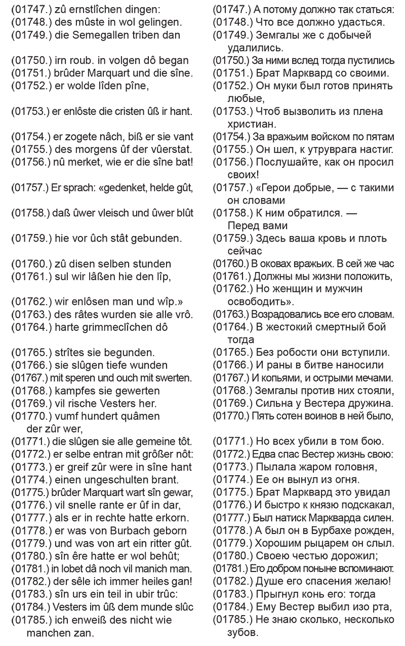 Фрагмент о нападении на земгалов на округ А шрате. Поединок комтура М аркварда с земгальским князем Виестурсом. Стихи 01729—01801.