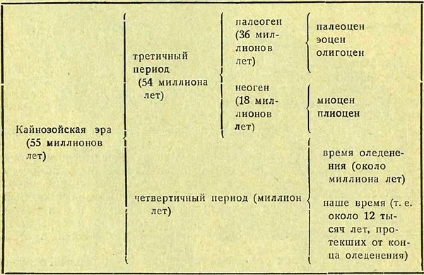 Прежние геологи делили историю Земли не так, как мы; они делили ее всего на три части; кайнозойская эра была по счету третьей, другими словами — третичной; потом оказалось что удобнее выделить самые последние времена истории Земли в особый отдел, в четвертый по счету, или четвертичный, отдел; а потом пришлось вообще отказаться от прежнего деления и перейти к такому геологическому календарю, который и приведен в этой книге.