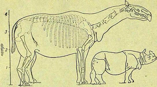 Среди первых носорогов многие были не выше овцы, но некоторые носороги выросли в гигантов. Таким гигантом был индрикотерий, безрогий носорог с длинной шеей и вытянутой, как у лошади, мордой. Он был вдвое больше нынешнего слона. Кости индрикотерия найдены в Средней Азии, в Монголии и близ Индии.