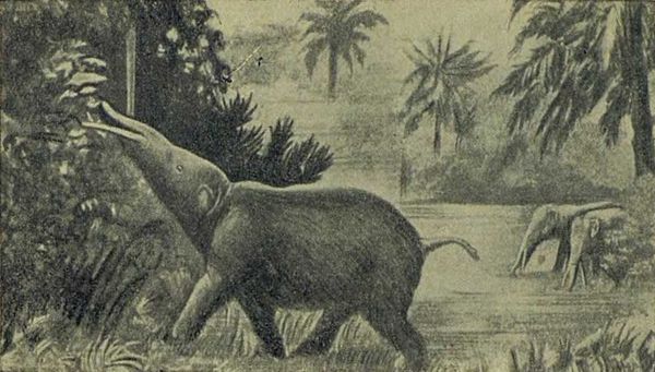 Именно такой небольшой слон без хобота и бивней (стр. 178) найден в палеогеновых пластах Египта; его назвали в отличие от теперешнего слона меритерием.