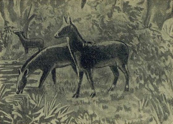 Потомков эогиппуса вы видите на страницах 182 и 183. Обе эти лошади жили все в том же палеогене, но уже в конце его. Они гораздо крупнее эогиппуса, но по сравнению с нынешней лошадью кажутся все же карликами.