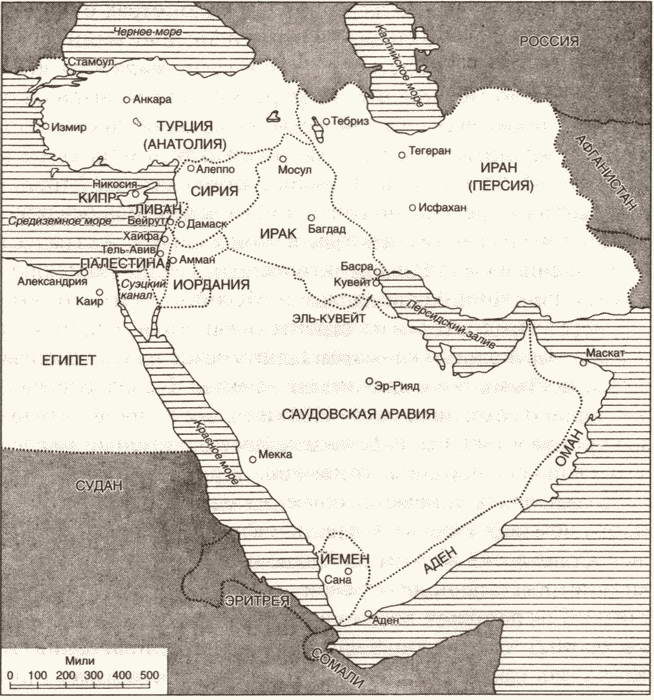 Западный край полуострова протянулся вдоль Красного моря. Здесь горы достигают высоты в 2700 метров в Хиджазе, родине ислама, и 4600 метров в Йемене. За время прохождения над горами влажные воздушные массы, приносимые с запада, практически теряют всю свою влагу, в результате чего во внутренних районах полуострова почти не бывает осадков. Июньская температура в Джидде составляет 43 градуса по Цельсию. На всем полуострове один лишь Йемен — знаменитая Счастливая Аравия римлян — получает достаточное количество осадков для выращивания различных сельскохозяйственных культур. Колыбель ваххабизма, Неджд, где правит династия Саудидов, является ядром северной части полуострова. Температура в Эр-Рияде в июне—июле достигает отметки 43 градусов. Аравийский полуостров, крупнейший во всем регионе, не имеет рек, впадающих в море, равно как и каких-либо озер. Его южная пустыня, Руб-эль-Хали, занимает площадь в 650 тысяч квадратных километров. В этот безлесный и безводный край нога европейца впервые ступила лишь в 30-х гг. XX в.