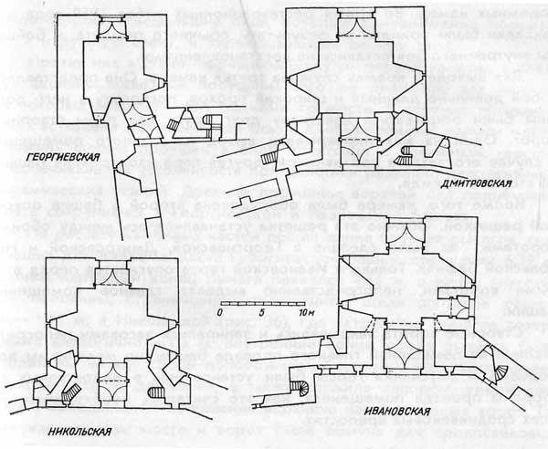 Планы воротных ярусов квадратных башен Нижегородского кремля: Георгиевская, Дмитровская, Никольская, Ивановская. Схема С. Л. Агафонова