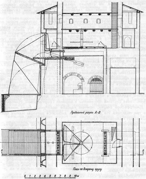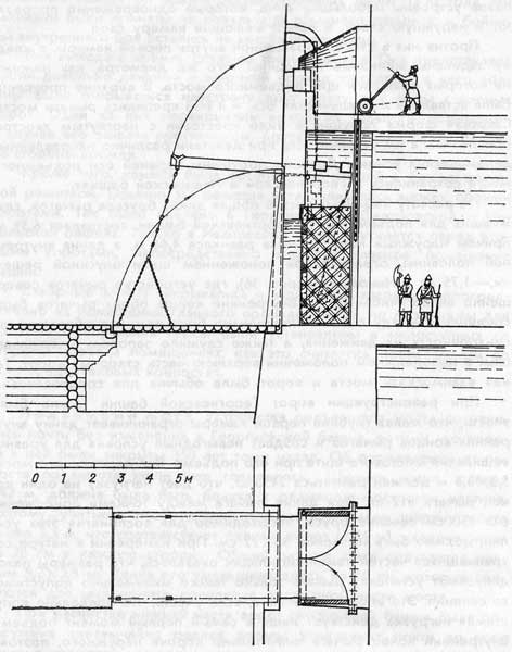 В нижегородских башнях высота решеток была рассчитана так, чтобы при поднятом положении они не доходили бы на 20–30 см до пола верхнего яруса. Щель перекрывалась двумя — тремя рядами кладки. Все это хорошо сохранилось в Ивановской башне, где по обеим краям щели были аккуратно выложены из кирпича воронки для пропускания цепей и свободного наматывания их на вал ворота. Здесь, как и в других башнях кремля, ворот установлен непосредственно над щелью герсы. Для этого в стене делалась специальная ниша, перед которой должно было оставаться пространство шириной не менее 2 м. В Ивановской башне арка перекрывала нишу так низко от пола, что в ней мог поместиться только вал такого ворота, какой был в Новодвинской крепости. Гладко отесанное бревно диаметром не менее 30 см оковывали железными полосами вдоль и поперек, и по спиральной линии бревна выдалбливались гнезда, куда при подъеме решетки упирались концы рычагов. Два или лучше четыре человека, действуя попарно и меняя рычаги, свободно могли управлять движением герсы, по-видимому, обходясь при этом без помощи противовесов.