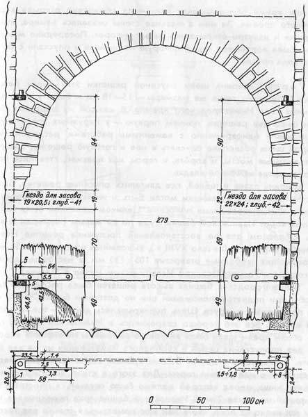 При расчистке нижней части ворот Никольской башни была обнаружена чрезвычайно редкая деталь, утраченная почти во всех русских кремлях, — в кладке западной стороны воротной ниши оказалась заделанной железная проушина (рис. 36). В отверстии диаметром 55 мм закреплялась железная ось, где вращался щит подъемного моста. Поднимали его двумя рычагами, которые двигались в специальных вертикальных пазах по обеим сторонам проема ворот. В Георгиевской башне эти пазы шириной 23–28 см сохранились на всю высоту — 4,65 м — от низа щели до ее перекрытия. Глубина обоих пазов — 1,14 м — была рассчитана таким образом, чтобы положение задней стенки, отстоящей на 35 см от внутренней плоскости проема ворот, давало возможность установить рычаги из деревянных брусьев сечением 30—31х20—22 см. В нижнем конце пазов устроены небольшие окна, которые одновременно прорезают и наружную стену, и перекрывающий камеру свод.