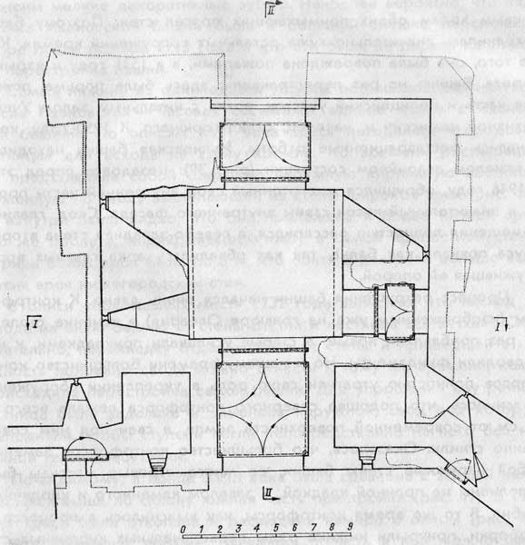 По-видимому, в конце XVIII века была сравнена с землей находившаяся выше по склону южная часть пристройки (рис. 41). В 1956 году здесь была откопана и расчищена камера с окном (рис. 42), но без дверного проема; очевидно, попасть в нее можно было только через люк в своде, и служила она для заключения преступников или военнопленных. Исследования показали, что над этой камерой было помещение того же размера и со своим особым выходом наружу. Все помещения пристройки восстанавливались по остаткам оснований стен и по форме и высоте ниш, заглубленных в кремлевскую стену. Лестница была восстановлена по нижним ступеням, заваленным землей и замурованным в кладке стены, а также по расчету расположения ступеней на наружной поверхности свода и остаткам выхода лестницы на уровень боевого хода.