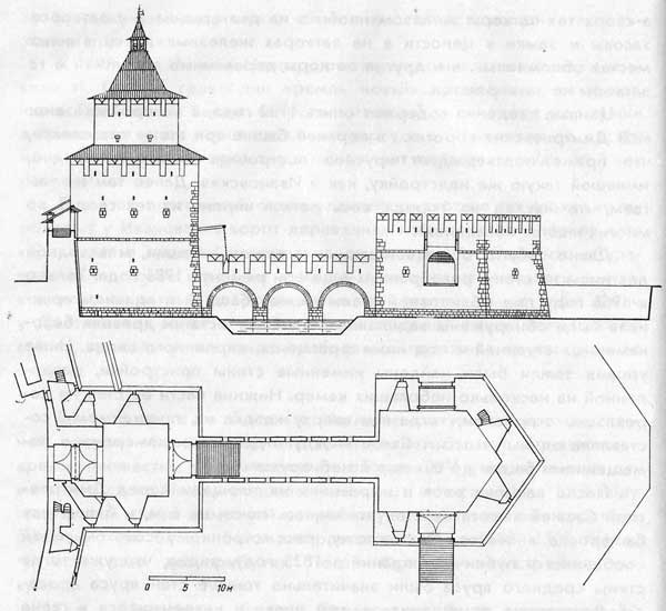Для удобного размещения ворот все эти башни построены квадратными в плане. В то же время их внутренняя планировка прежде всего должна была обеспечить фланкирование стен и поэтому была во многом подобна круглым башням. Только проезд, занимающий почти целиком первый или, что чаще, второй ярус башни, заставлял вносить поправки в общую схему плана: так, отдельные входы вели в правую и левую части башен, боевые печуры, фланкировавшие соседние прясла и проходы в них, были тщательно изолированы от проезда.