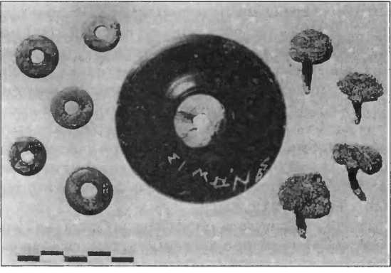 Основание чаши с именем сапожника Симона среди гвоздиков и колечек для шнурков