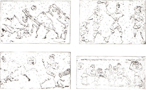 Богатое скульптурное убранство надгробного храма по большей части рассеяно вокруг развалин здания и находится в плохом состоянии. На большинстве рельефов изображены сцены из повседневной жизни семьи землевладельцев, которой принадлежал этот монумент. Сохранилась также длинная надгробная надпись с многочисленными именами (все имена принадлежат местным жителям). Четыре фрагмента, которые приведены на нашей таблице, показывают жизнь на полях имения. Из изображенного на рельефах видно, что жизнь на краю пустыни была полна разнообразных опасностей; ср. нашу Табл. 37, где показана подобная картина жизни в степях Крыма. Первый фрагмент изображает пахоту на верблюдах и быках, второй — сражение с местными жителями, третий — битву с дикими зверями, четвертый — молотьбу и транспортировку зерна с поля в корзинах. Надгробный памятник создан не позднее IV в. н. э.
