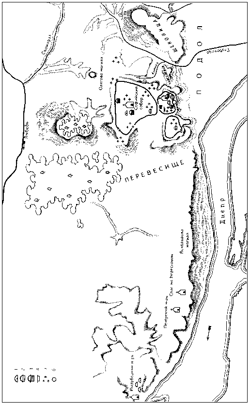 Киев и его окрестности в X–XIII вв. (по Л.А. Голубевой): 1 – курганные погребения с трупосожжением IX–X вв.; 2 – курганные погребения с трупосожжением в гр> вой могиле IX–X вв.; 3 – погребения в срубных гробницах IX–X вв.; 4 – погребения в грунтовых мог конца X – начала XI в.; 5 – церковные кладбища XI–XII вв.; 6 – братские могилы XIII в.