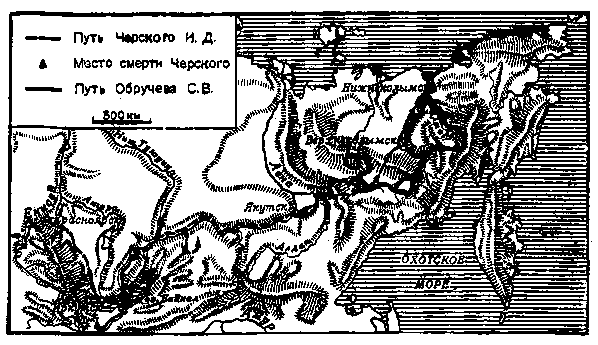 Из Якутска путь экспедиции лежал на северо-восток, и был этот путь параллелен той караванной тропе, по которой ехал на Колыму вместе с женой и сыном Иван Дементьевич Черский. За три с половиной десятилетия до Обручева, уже миновав верховья Индигирки, Черский встретил горные хребты и замерил их простирание. Вопреки прежним представлениям хребты эти тянулись не вдоль основных рек района — Индигирки и Колымы, а поперек, в сторону большой низменности, изображенной на картах в верхней части бассейна Индигирки.