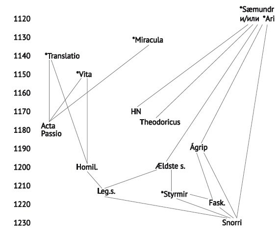* Обозначения в схеме: 'Ari – «'Жизнеописание конунгов» Ари Мудрого; ?grip – «Обзор саг о норвежских конунгах»; Fask – «Красивая кожа»; HN – «История Норвегии»; Homil. – «Древненорвежская книга проповедей»; ?HLeg – «Легендарная сага об Олаве Святом»; ?H?ldste – «Древнейшая сага об Олаве Святом»; 'miracula – собрание чудес св. Олава; Passio – Житие св. Олава архиепископа Эйстейна; Snorri – труды Снорри Стурлусона; 'Styrmir – ««Жизнеописание Олава Святого» Стюрмира Карасона; *S?mundr – несохранившийся перечень норвежских конунгов Сэмунда Мудрого; Theodoricus – «История о древних норвежских королях» Теодорика; ‘Translatio – «'Translatio sancti Olavi»; 'vita – жизнеописание св. Олава.