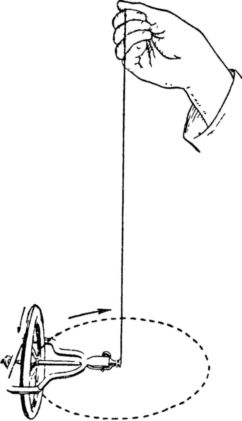 К нашему удивлению, гироскоп сохранит приданное ему положение. Он будет лишь описывать окружность. Быстро вращающееся велосипедное колесо, подвешенное на веревке за удлиненную ось к потолку, станет «вести себя» точно так же, как и гироскоп в только что описанном случае (рис. 38).