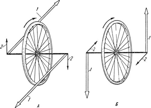 Рис. 39. Направление сил прецессии, возникающих под влиянием усилий, стремящихся повернуть ротор гироскопа, или ось велосипедного колеса. 1 — прецессионные силы; 2 — сила, прилагаемая к оси колеса, чтобы повернуть его.