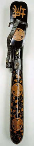 Второй тип – закрытые колчаны, тоже был по-своему удобен. Он лучше защищал стрелы от непогоды и исключал возможность потери стрелы при передвижении воина, хотя и требовал большего времени на извлечение стрелы. Самый простой колчан этого типа – «цубо-ямагути» (ил. 4.4), выполненный в форме вытянутого футляра. Наиболее известный (классический) закрытый колчан появился в начале периода Муромати (1333-1573 гг.), который вскоре вытеснил ранее существовавшие образцы. Эти колчаны имели цилиндрическую или сигарообразную форму с закруглённым верхним концом. Они получили название – «уцубо». К этому типу относится колчан хранящийся в оружейном фонде ЦВММ (ил. 6). Верхняя часть колчана имела овальный вырез для загрузки и извлечения из колчана стрел, который в походе закрывался крышкой. Крышка на горловине колчана удерживалась в закрытом положении костяной застёжкой – «кохадзе». Колчаны снабжались двумя ремнями, изготовленными из шёлковых или кожаных полос, которые удерживали его за спиной или на поясе воина. Короткий левый ремень назывался «какео». Он снабжался металлическим кольцом, расположенным посередине. К этому кольцу крепился и правый, более длинный ремень – «укео». Здесь же крепилась и катушка с запасной тетивой – «цурумаки». В доме самурая лук, колчан и стрелы располагались на специальных подставках – «тядо-какэ» (ил. 7).