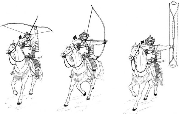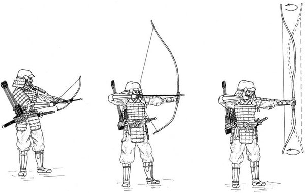 Заметим, что в Европе эта операция выполнялась наоборот. Натяжение тетивы лука осуществлялась правой рукой, тогда как, вытянутая вперёд левая рука лишь фиксировала лук в нужном направлении.