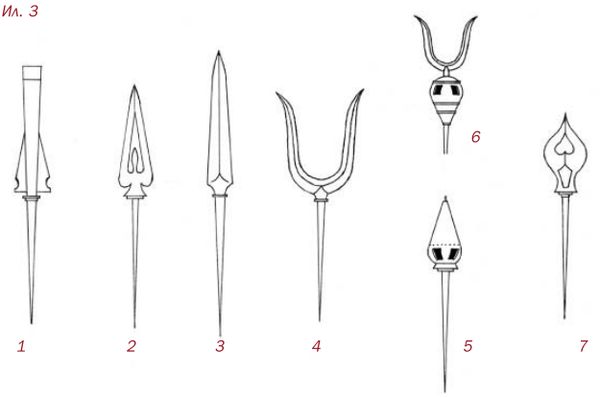К категории редких относилась и «родовая стрела», на которую наносился «ка-мон» – указатель родового клана владельца (фамильный герб), иногда имя владельца прорубалось на самом лезвии стрелы (ил. 5) – такая форма наконечника стрелы называлась – «хира-нэ». Наконечники этих стрел отличались высоким качеством изготовления, художественным оформлением, порой с использованием серебра и золота. Такая стрела обычно оставалась в колчане и, возможно, выполняла роль визитной карточки. Некоторые историки считают, что она никогда не использовалась в бою и предназначалась для опознания самого воина в случае его гибели.