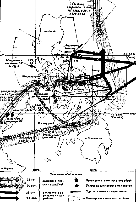 Японские корабельные группировки вышли из баз 20 октября и, неся потери от ударов развернутых на пути их следования американских подводных лодок и авианосной авиации (особенно пострадало наиболее мощное центральное соединение, которым командовал вице-адмирал О. Курита), к исходу 24 октября прибыли в район проведения операции. Хотя американские летчики доложили, что нанесли тяжелые повреждения нескольким кораблям центрального соединения, но оно еще представляло собой грозную силу.