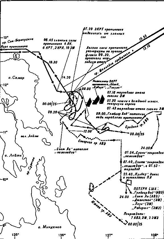 В момент установления контакта японское соединение следовало курсом 200°, причем все 4 линейных корабля шли в кильватерной колонне в центре ордера. Слева от них на дистанции 20 кабельтовых находилась колонна из 4 тяжелых крейсеров. Справа на такой же дистанции шли еще 2 тяжелых крейсера. Охранение в составе 6 эскадренных миноносцев, возглавляемых легким крейсером «Носиро», было развернуто в 7,5 кабельтовых на носовых курсовых углах по правому борту правой колонны, а еще 4 эскадренных миноносца с легким крейсером «Яхаги» занимали аналогичное место по левому борту левой колонны. Это было грозное соединение, насчитывающее 22 боевых корабля. «Мы планировали вначале вывести из строя авианосцы,., а затем разгромить все оперативное соединение», — писал Курита в своем боевом донесении. Первым маневром японского адмирала явилось изменение курса в восточном направлении. «Я лег на курс 110°, — писал Курита, — чтобы выйти на наветренную сторону. В результате этого маневра все корабли оказались в кильватерной колонне. Я намеревался сократить дистанцию, придерживаясь наветренной стороны американских сил». Этот маневр не только затруднял подъем самолетов, но и отрезал отход американского соединения в сторону моря, вытесняя его к острову Лейте. «Нашим первым намерением было драться до последнего с американскими кораблями и затем, если мы одержим победу, идти в залив Лейте», — заявил Коянаги. Таким образом, первоначально японцы всерьез собирались дать решительный бой авианосцам, а после этого уничтожить американские транспортные суда и отойти через пролив Суригао.