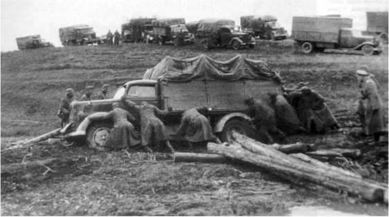 О роли величайшего военачальника Генерала Шламм (Грязь – нем) в битве под Москвой сказано немало, часто именно ему отдают право называться победителем вермахта в октябре 1941 г. Однако в условиях дождей и распутицы немцы благополучно вели боевые действия летом, после сильных дождей в начале июля 1941 г. и в конце июля. Уманский «котел» был образован продирающимися через раскисший украинский чернозем соединениями. Распутица влияла на обе стороны и вермахт с его мощными полугусеничными тягачами оказывался как бы не в более выгодном положении. Также проблема вскоре стала сглаживаться замерзанием почвы по ночам, что давало возможность гнать снабжение вперед на грузовиках. Более того, нельзя забывать, что для Красной армии застрявший танк или грузовик оказывался безвозвратно потерянным ввиду медленного, но неуклонного смещения фронта на восток. Вермахт мог оставить стада автомашин позади, а затем вернуть их в свои соединения.