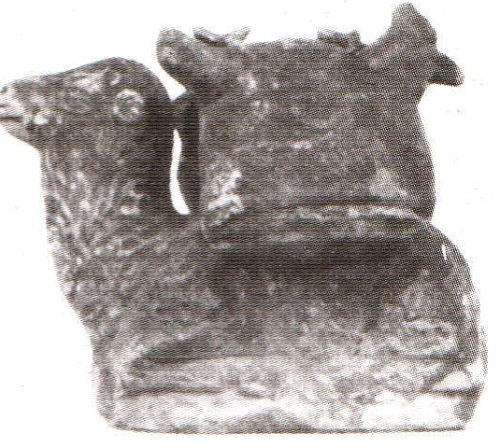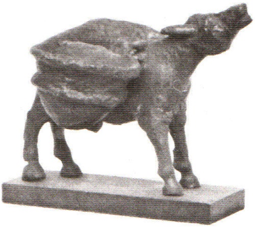Осел с корзинами для переноски грузов, кричащий «и-a», голова поднята, ноги вытянуты прямо. «Surtout de table» подобного рода описан у Петрония. Сеп. 31: «ceterum in promulsidari asellus erat Corinthius cum bisaccio positus, qui habebat olivas in altera parte albas, in altera nigras» [впрочем, на блюдо был поставлен коринфский осел с двумя вьюками, у которого в одном вьюке были белые сливы, а в другом черные (лат.). Пер. А. К. Гаврилова].