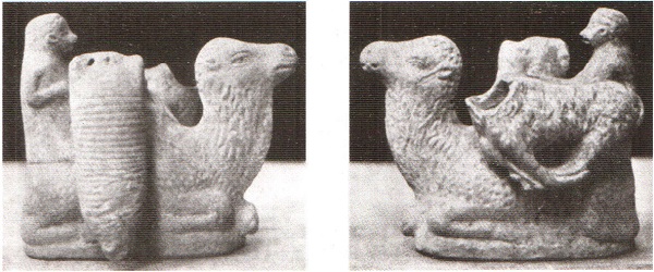 Верблюд опустился на колени, погонщик сидит у него на спине. Поклажа состоит из большого кувшина для вина и овцы (голова овцы или ягненка не сохранилась).