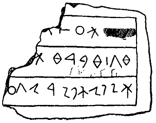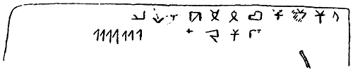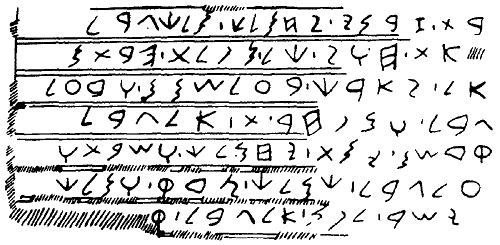 Теперь перейдем к описанию самого хода дешифровки. Если где-либо и уместна фраза о «колумбовом яйце», то именно здесь. Чтобы легче было следить за мыслями Дорма, необходимо поместить еще раз рисунок обратной стороны бронзовой таблички «с».