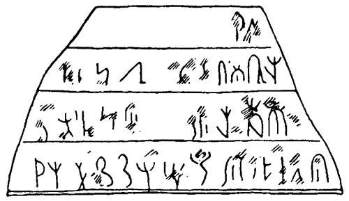 Мы видели выше, как успешно выступил востоковед Дорм в качестве опытного дешифровщика сразу же после французских раскопок 1929 года, когда в Рас-Шамре были извлечены на свет таблички с неизвестной клинописью, Дорм оказался на месте и тогда, когда был сделан целый ряд других в высшей степени интересных находок. Мы имеем в виду результаты весьма плодотворных французских раскопок древнего финикийского города Библа. В числе прочего материала здесь нашли две стелы, две бронзовые таблички, несколько лопаточек и ряд фрагментов каменных плиток — все это было покрыто никогда не виданными до того времени письменными знаками! На этот раз речь шла уже не о клинописи, а о знаках, имеющих некоторое сходство с египетскими иероглифами, вследствие чего они фигурировали вначале под не совсем удачным названием «псевдоиероглифическая письменность из Библа».