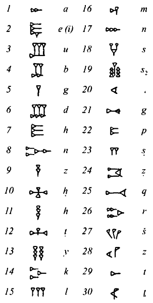 [С чисто внешней стороны угаритское письмо представляет собой особую форму клинописи, потому что содержит элементы в виде клиньев, и знаки, как в вавилонской клинописи, пишутся на глиняных табличках слева направо. Но внутренняя форма угаритской клинописи и вавилонской совершенно различна. В последней насчитываются сотни иногда довольно сложных знаков, идеограмм, слоговых знаков и детерминативов. В угаритском же письме только тридцать довольно простых по форме знаков, в основном это обозначения для согласных; нет ни идеограмм, ни детерминативов, только вместо одного «алефа» западносемитского письма здесь имеется три значка: для обозначения сочетания «алефа» с основными гласными a, i, u. Таким образом, угаритское письмо представляет собой письмо, развивавшееся параллельно семитскому консонантному письму, но под влиянием всесильной вавилонской традиции приобретшее клинообразную форму и использовавшее глиняные таблички в качестве писчего материала.]