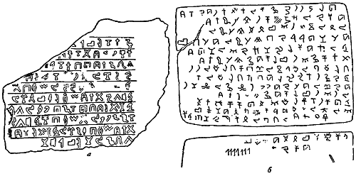 Рис. 139. a — стела с гублской надписью; б — бронзовая табличка, покрытая гублскими письменами: вверху — лицевая, внизу — оборотная сторона.