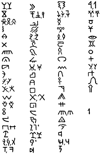 Уже на месте находки памятников было замечено, что новая письменность имеет сравнительно мало знаков (тогда было известно 27, ныне 30, ряд исследователей различают 32). Сделал это наблюдение специально приглашенный человек, а именно — Шарль Виролло. Одновременно он заключил, что перед ним алфавитная письменность — ограниченное число знаков не допускало и мысли о слоговой письменности или идеограммах.