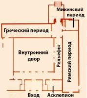 Небольшой зал Асклепиона представляет множество глиняных посвятительных даров, пожертвованных богу больными. Особый интерес представляют глиняные имитации рук, ног, половых органов, голов и т.п. 4 в. до н.э. почти в натуральную величину. Женские ноги и руки в отличие от мужских покрыты белой краской.