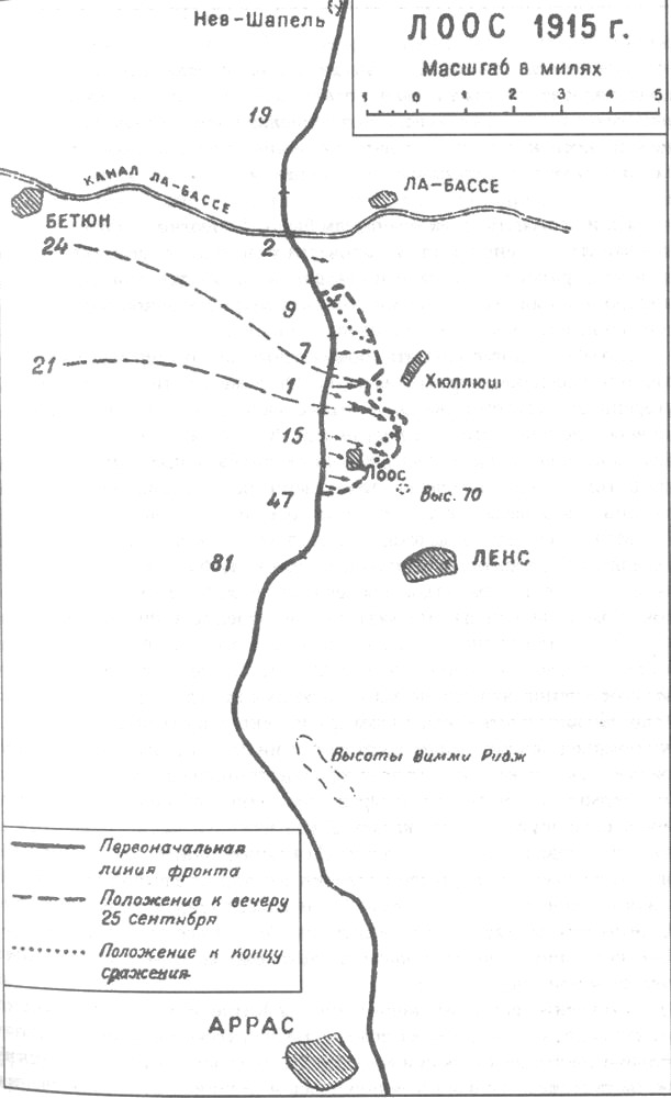 Бегство их создало брешь в изломанном фронте британцев между Лоосом и Хюллюшем. Для заполнения ее пришлось подтянуть гвардейскую дивизию. Между тем германские контратаки, особенно на флангах, участились. Наконец, уже 28 сентября на помощь англичанам пришел Фош, взявший на себя не только защиту части британского сектора на фланге близ Лоос — он помог и местным успехом у Вими-Ридж, куда для сдерживания успеха французов был почти целиком стянут только что прибывший германский гвардейский корпус.