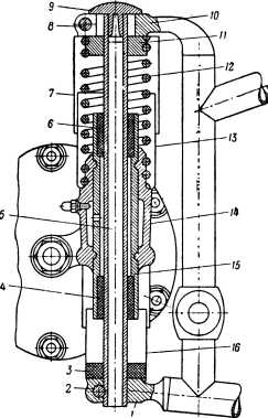 Рис. 124. Подвеска заднего колеса мотоцикла М-72: 1 — нижний наконечник задней вилки; 2 — стяжной болт нижнего наконечника; 3—резиновый буфер; 4— нижняя направляющая втулка; 5 — стержень подвески; б — верхняя направляющая втулка; 7 — верхний защитный кожух; 8 — стяжной болт верхнего наконечника; 9 — алюминиевая заглушка; 10 — верхний наконечник задней вилки; 11—наконечник пружины; 12 — пружина задней подвески; 13 — средний защитный кожух; 14 — кронштейн подвески; 15 — усилительная стальная втулка кронштейна подвески; 16 — нижний защитный кожух.