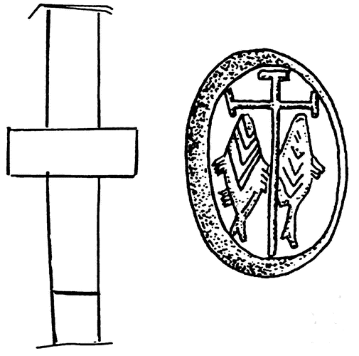 Рис. 52. Изображение креста и рыб на сердоликовой вставке бронзового перстня II–III вв. по P. X. Могильник у д. Ново-Отрадное. Крым