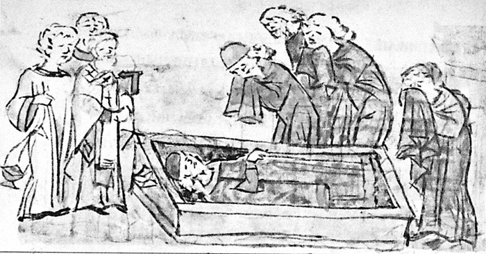 Отпевание и погребение умершего великого князя Вячеслава Владимировича великим князем Ростиславом Мстиславичем. Миниатюра из Радзивилловской летописи. XVI в.