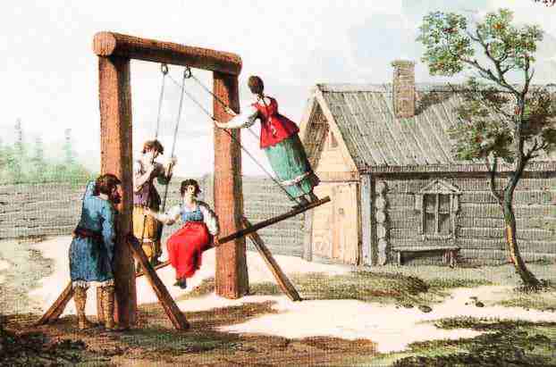 Любимой забавой женщин и девиц, знатных и простолюдинок, были качели и доски. Простолюдинки в посадах и деревнях качались на улицах, на открытых местах, а в зажиточных и боярских домах качели были необходимой принадлежностью сада или двора, то есть той части его, которая прилегала к женской половине жилья.