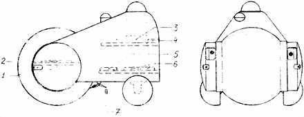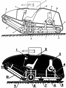 1 — рама, 2 — ведущий барабан, 3 — направляющий барабан с натяжным приспособлением, 4 — прижимной барабан, 5 — тканевые гусеница, 6 — «рулевое» колесо, 7 — руль, 8 — сиденье, 9 — двигатель, 10 — карданный вал, 11 — корпус, 12 — пулеметная башня. Хорошо видно, что при общих скромных размерах машины намеченная пунктиром башня не вместила бы ни реальный пулемет, ни пулеметчика. Внизу — в поздних рисунках «Вездеход» преображался; здесь, например, исчезла ниша воздухозаборника в корпусе (из книги Косырев Е.А., Орехов Е.М., Фомин Н.Н. «Танки», Издательство ДОСААФ СССР, 1973 г.).