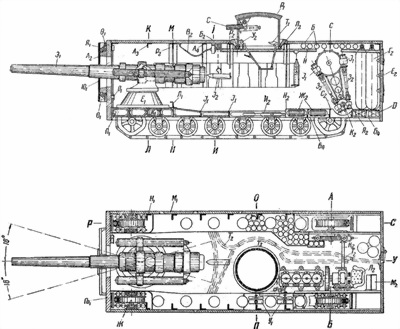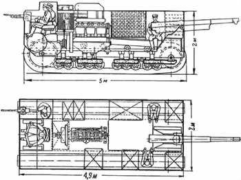 Вверху — схематический разрез «Вездехода» (из журнала «Танкист» № 5 за 1952 г., выполнен якобы по памяти участником работ В.И. Рабиновичем):