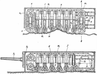 Пороховщиков был далеко не единственным, кто пытался в те годы разработать гигантскую машину с обильным вооружением. Но предложение о «распределении по звеньям» он воспринял и к концу 1915 г. представил доработанный проект «Земного броненосца», состоявшего теперь из шарнирно соединенных звеньев — бронеплощадок, «могущих отклоняться друг от друга по всем направлениям». Бронеплощадки и здесь были двух вариантов — с броневыми орудийными башнями и с рубками для десанта. Каждая площадка состояла из двух комплектов барабанов и каркаса с бронированием. Понятно, что и этот проект рассматривать детально не стали.