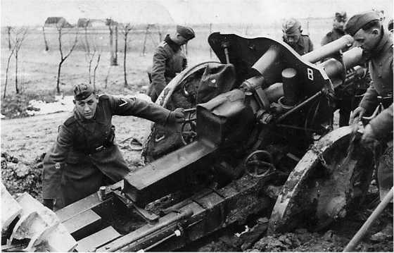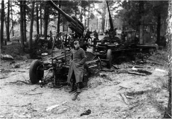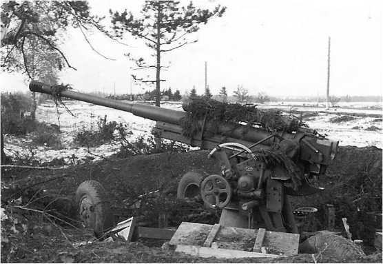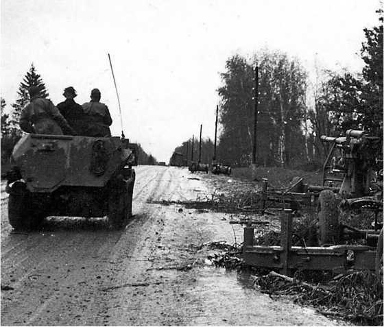 Немецкий бронетранспортер SdKfz.250 проезжает мимо 85-мм зенитки, поставленной на прямую наводку на дороге