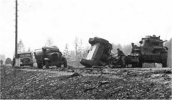 Перевернувшийся на шоссе у деревни Воробьи немецкий танк Pz.38(t) 19-й тд