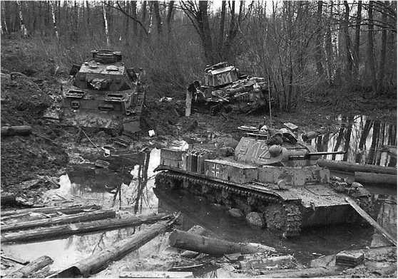 Подорвавшиеся на минах немецкие танки у деревни Бухоловка