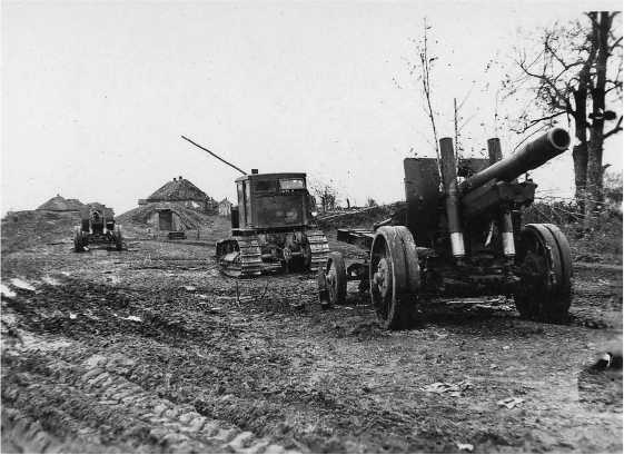 Две брошенные 152-мм гаубицы-пушки МЛ-20 и тягач одной из них – сельскохозяйственный трактор С-65