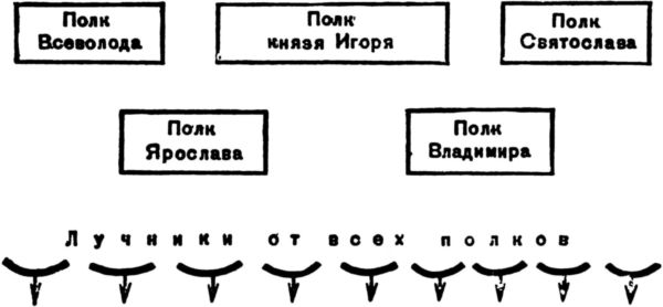 Летописное сказание о походе князя Игоря сообщает о боевом порядке русских полков. Князья «изрядиша полков 6. Игорев полк середе, а поправу брата его Всеволож, а полеву Святославль сыновця его, напереде ему сын Володимер и другой полк Ярославль, иже бяху с Ольстином Коуеве, а третий полк напереди же стрельцы, иже бяхуть от всих князий выведени; и тако изрядиша полны своя».