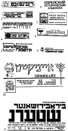 Еврейские журналы и газеты после перестройки: 1. Ренесанс; 2. Черно-вицер блетер; 3. Возрождение; 4. Унзер кол; 5. Еврейская газета; 6. Еврейский исторический альманах; 7. Наша жизнь; 8. Шалом; 9. Еврейский мир; 10. Эйникайт, орган Еврейского культурного и социального общества в Киеве; 11. Биробиджанер штерн, орган Еврейского обкома КПСС и областного Совета Еврейской АО