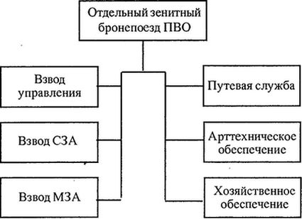 В организационном отношении зенитный бронепоезд представлял собой отдельную часть, которая подчинялась непосредственно командующему корпусным, дивизионным районом (корпусом, дивизией) ПВО. Он состоял из следующих подразделений: взвода управления, взвода зенитной артиллерии среднего калибра, взвода малокалиберной зенитной артиллерии, службы восстановления пути, службы арттехнического обеспечения, хозяйственного отделения.